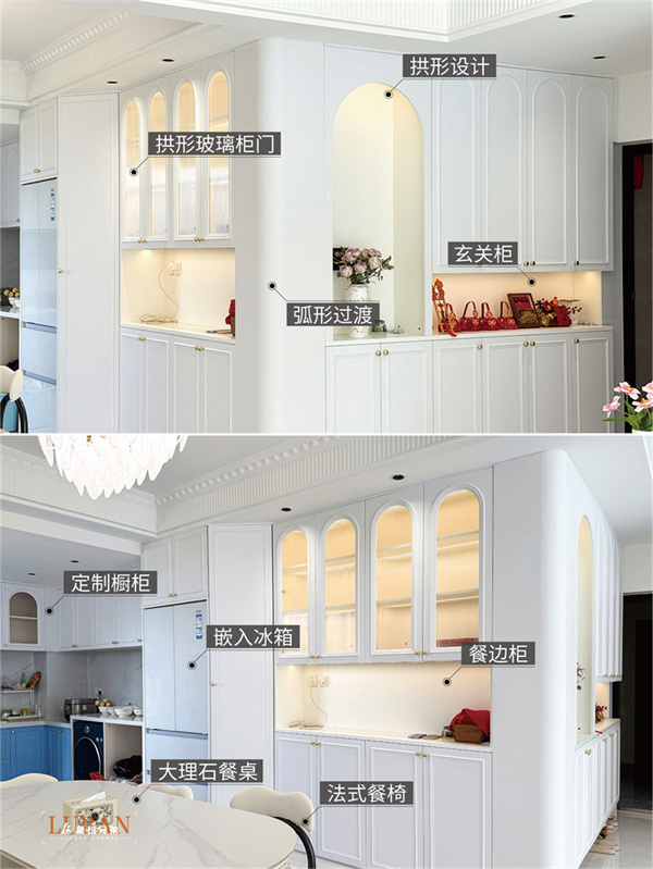 💚 客餐厨做开放式设计,空间通透明亮,定制柜体、家具等都运用了优雅弧线、圆润形态,🌰增强视觉延伸感,让空间显得更加曼妙精致。玄关柜和餐边柜🌟做了相连贯的造型,高效收纳的同时,凸显出独特的审美。