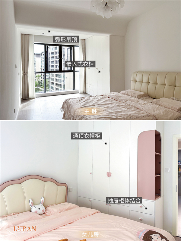 💚 主卧在奶油白的基调下,显得治愈而知性,床边做嵌入式衣柜,收纳满满,🧩与弧形吊顶搭配,让法式家更显简洁优雅。次卧奶油色与脏粉巧妙融合,🐬精致的线条与细节提升空间品质,充满童趣与舒适感。
